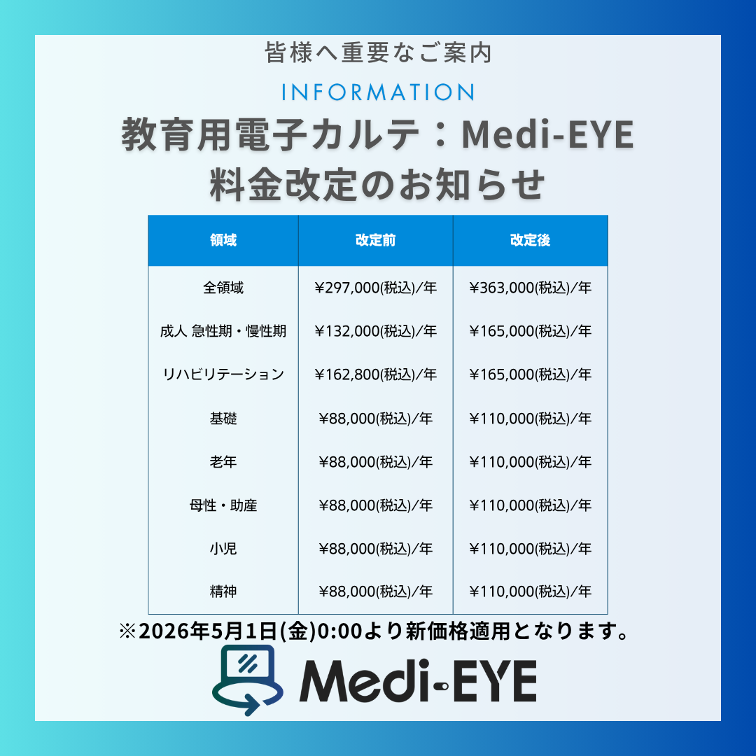 教育用電子カルテ:Medi-EYEはこのたび、2026年5月から料金改定を実施いたします。